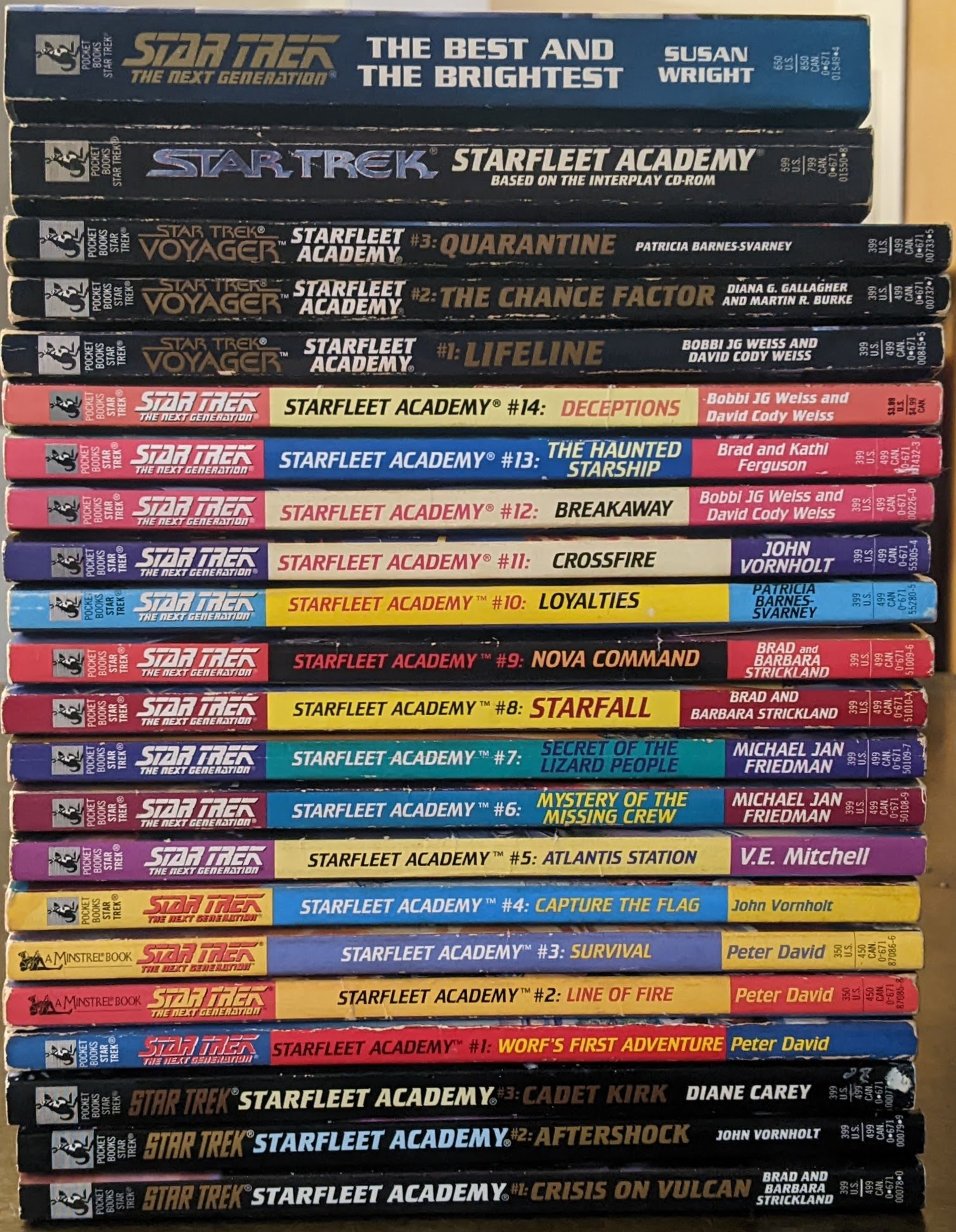 I recently went back and read all twenty of these Starfleet Academy adventures. If that sounds daunting, let me reassure you that it isn’t. Even if you just cruise through two a week, easily done during miscellaneous moments, you’ll get through the full set in a mere ten weeks, which happens to be the same amount of time it takes for, say, a ten-episode television season of a modern-day series to air.